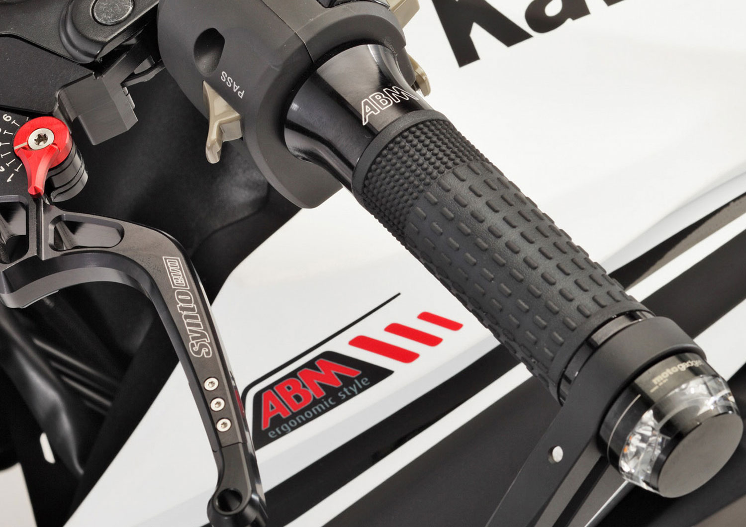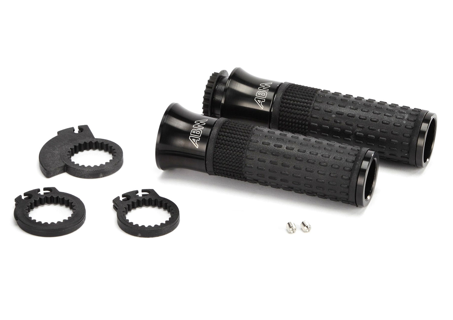 A pair of ABM sGrip CNC turned 22mm motorbike clutch and throttle handlebar grips. Shiny colour black anodised to match ABM handlebars and bar end weights.