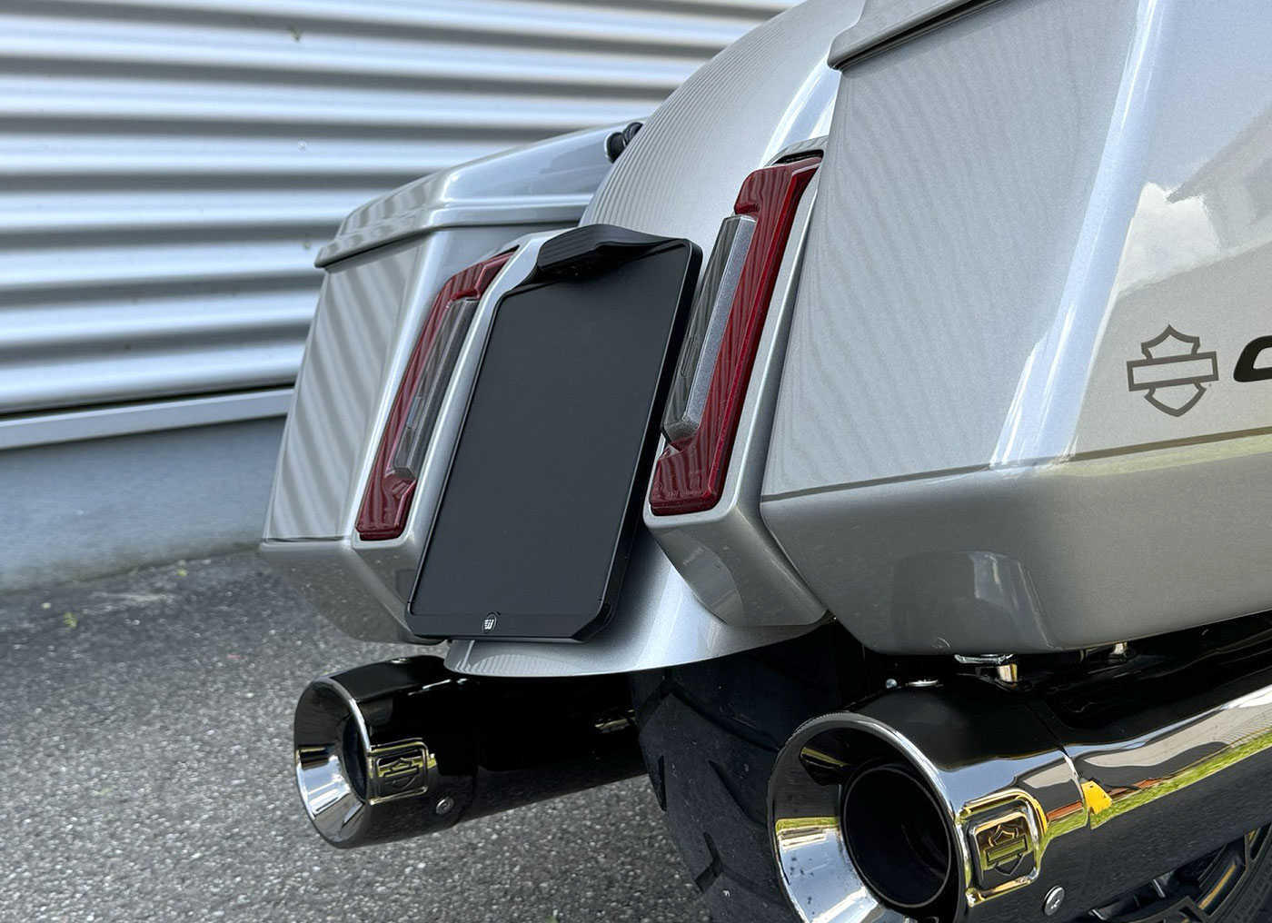 For the Harley Davidson Softail Glide models 2023 onwards as listed on the detail pages, this is the premium Wunderkind 2Stripes design centre rear mount license number plate holder.