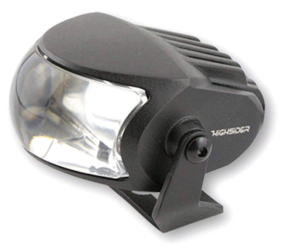These Highsider Comet 55mm x 36mm Low or Main Beam LED SMD Headlights are fully E-approved for motorcycle use, they are a tiny LED symmetric low or main beam headlight in a matt black aluminum housing with sturdy steel holder.