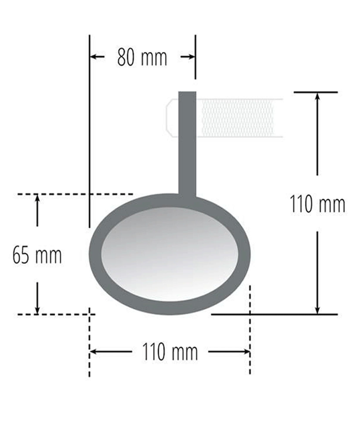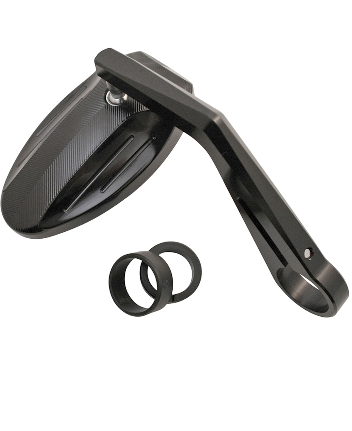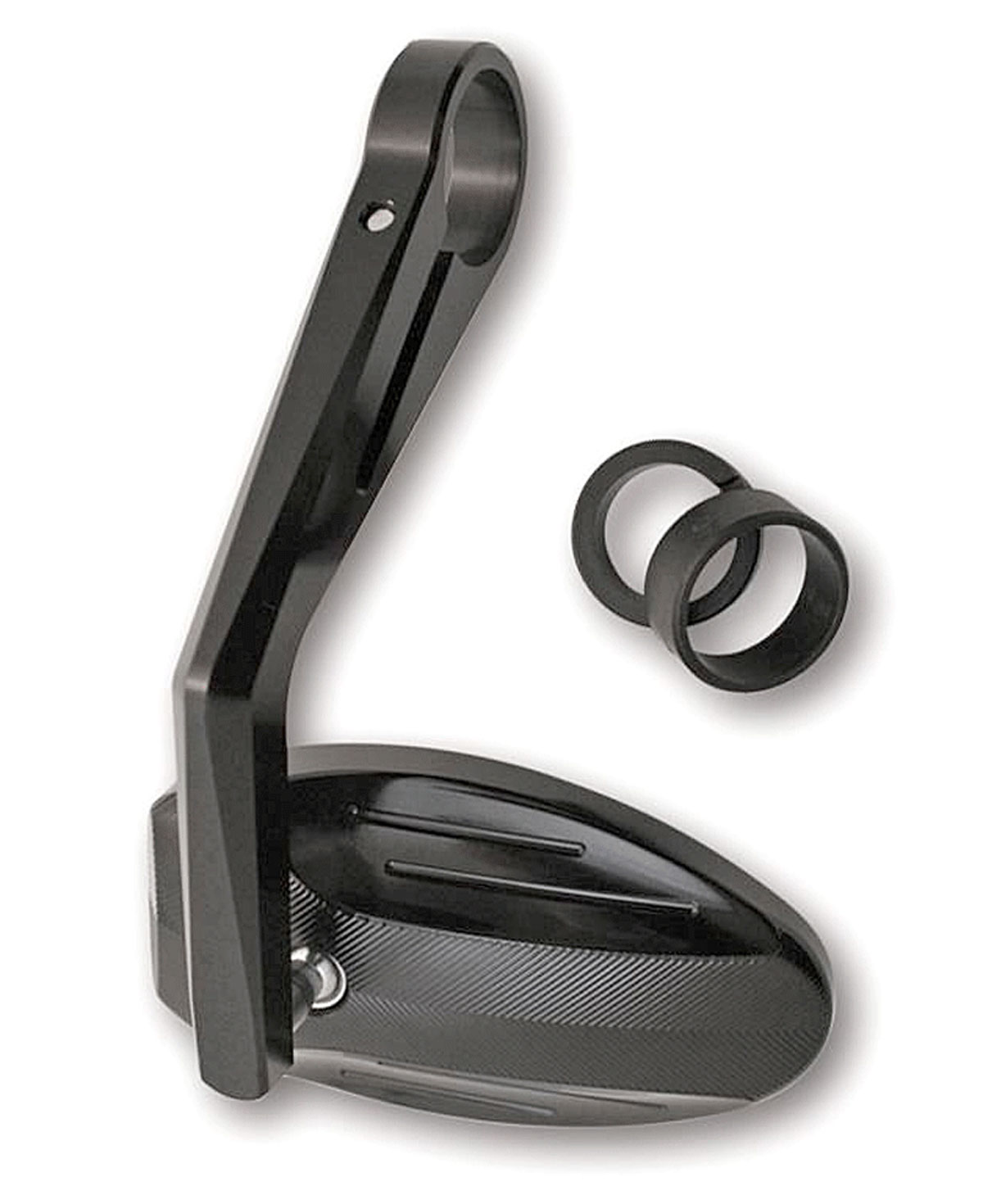 Nice mirror made of black aluminum. Fine, milled grooves at the oval head underline the high-quality processing and the great optics. 30mm diameter ring (for bar ends) and using reducers fits 1 inch (25.4 mm) and 7/8 inch (22 mm) handlebars directly.