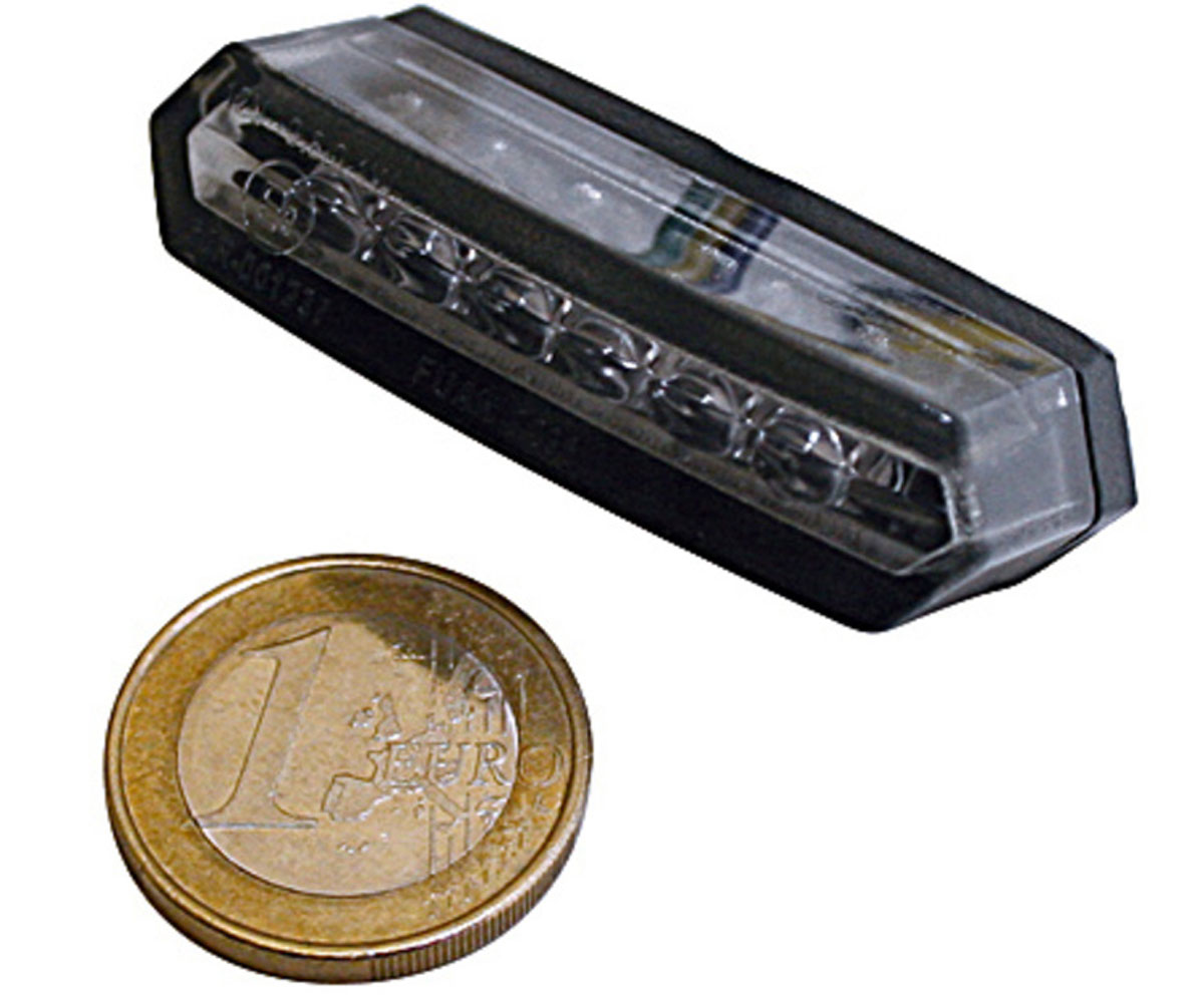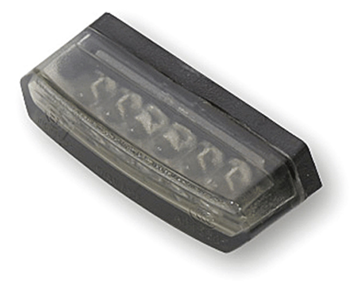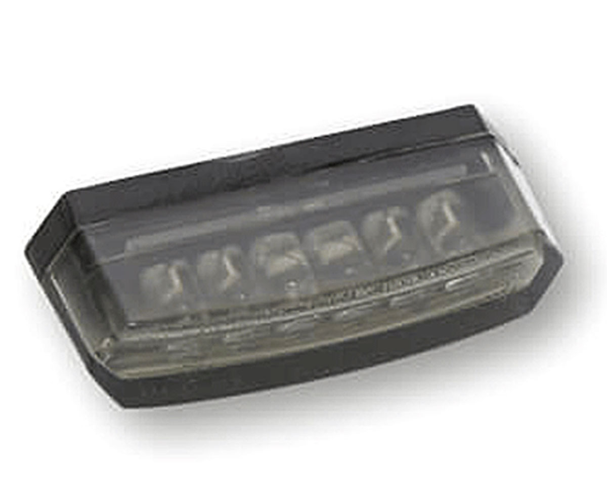 This 2" wide LED Highsider pro Malibu motorcycle stop and tail Light has a smoked lens and is on a black mounting plate. It is fully road legal being e-marked.
