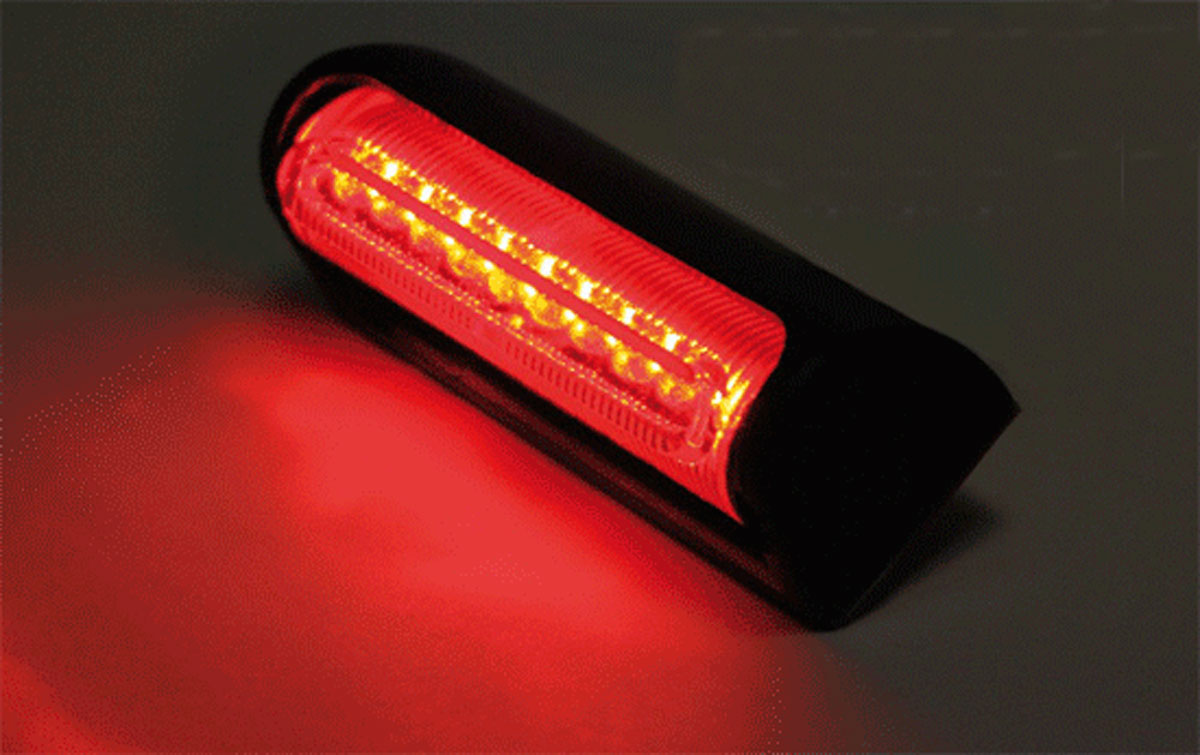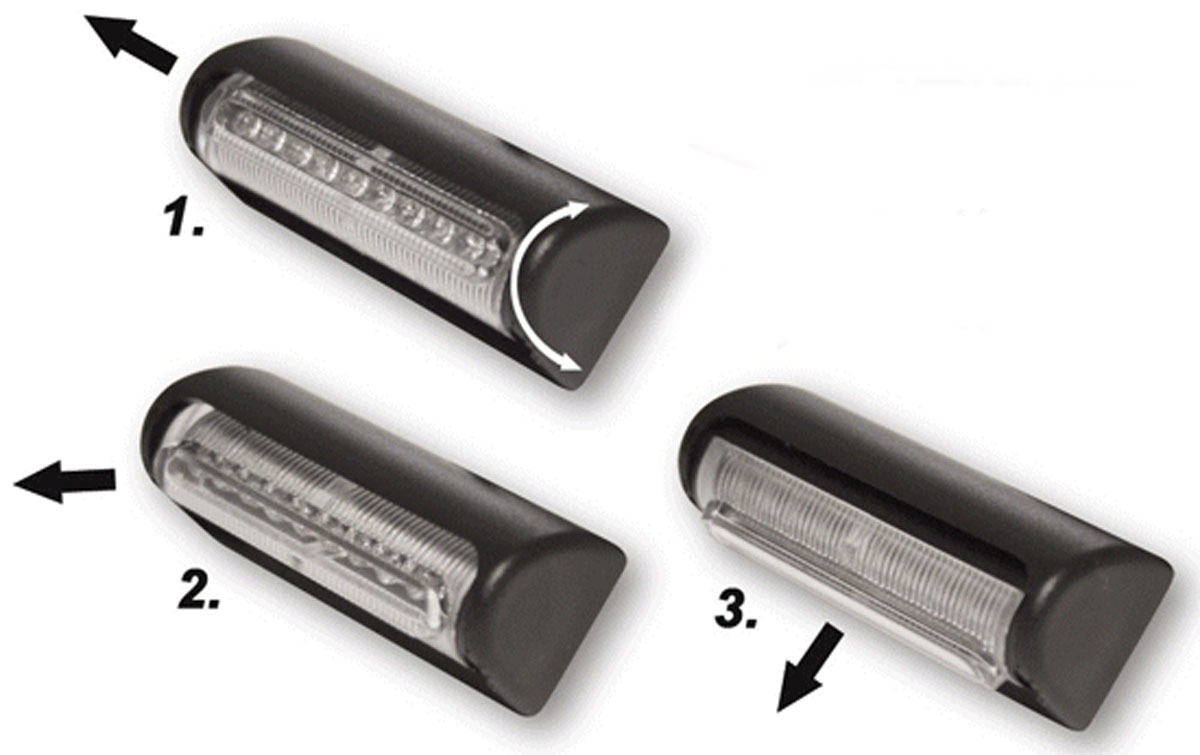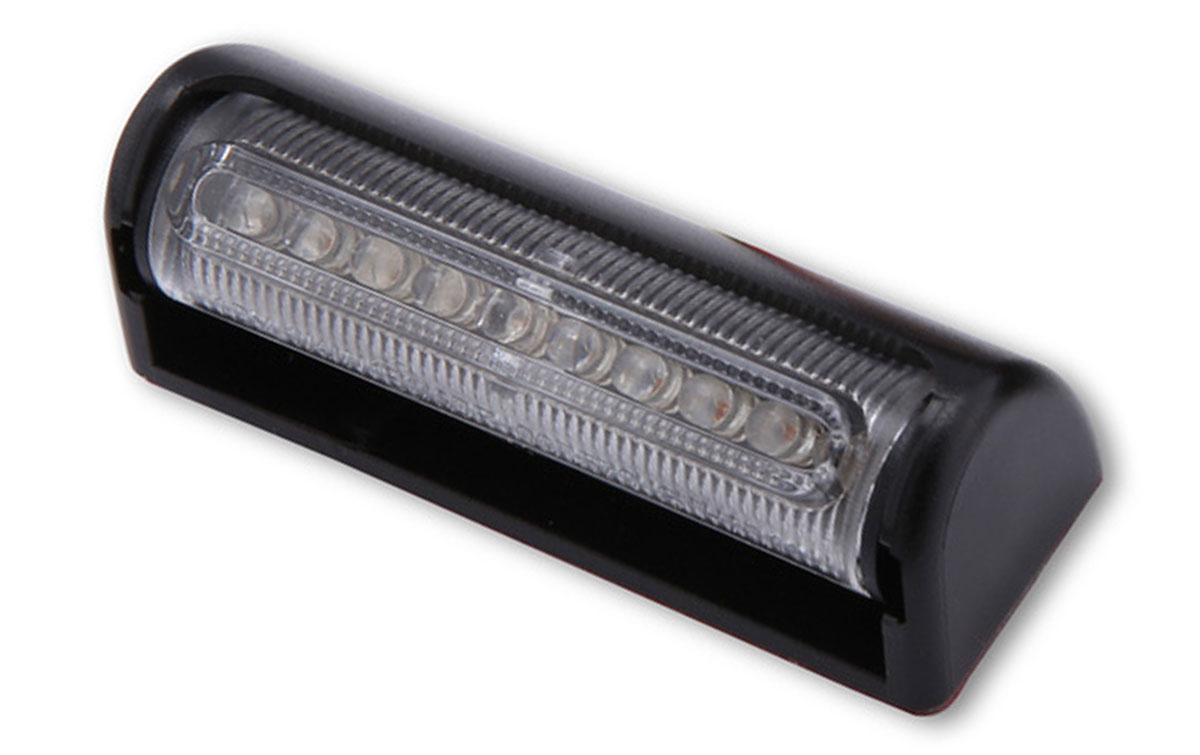 The Highsider Multiflex multi adjustable angle motorcycle LED stop and tail light, has a black plastic base, a clear lens, and is E-marked. Attached by an adhesive pad which is included.