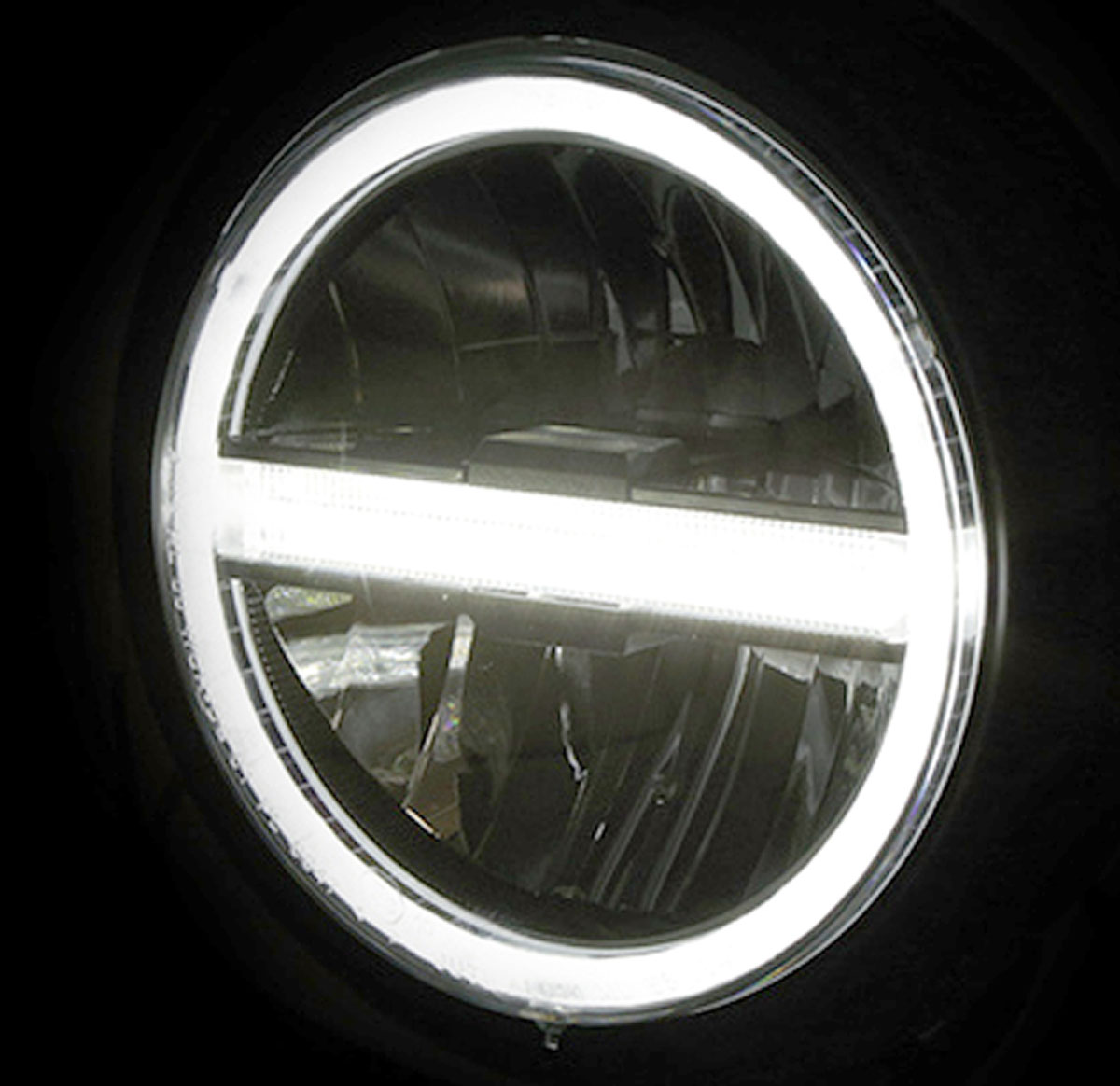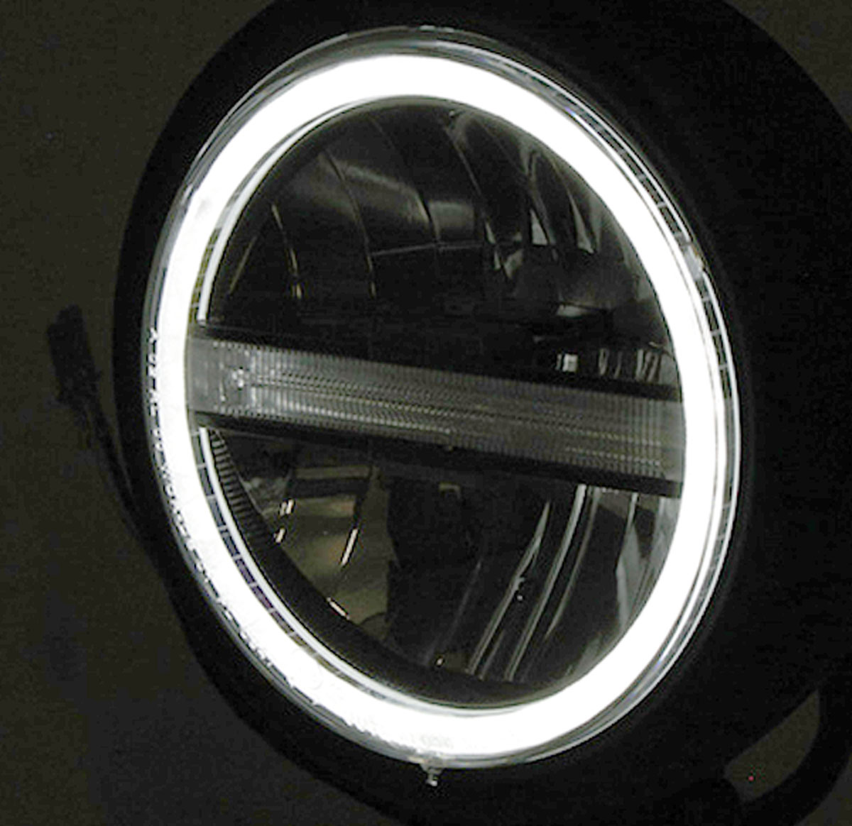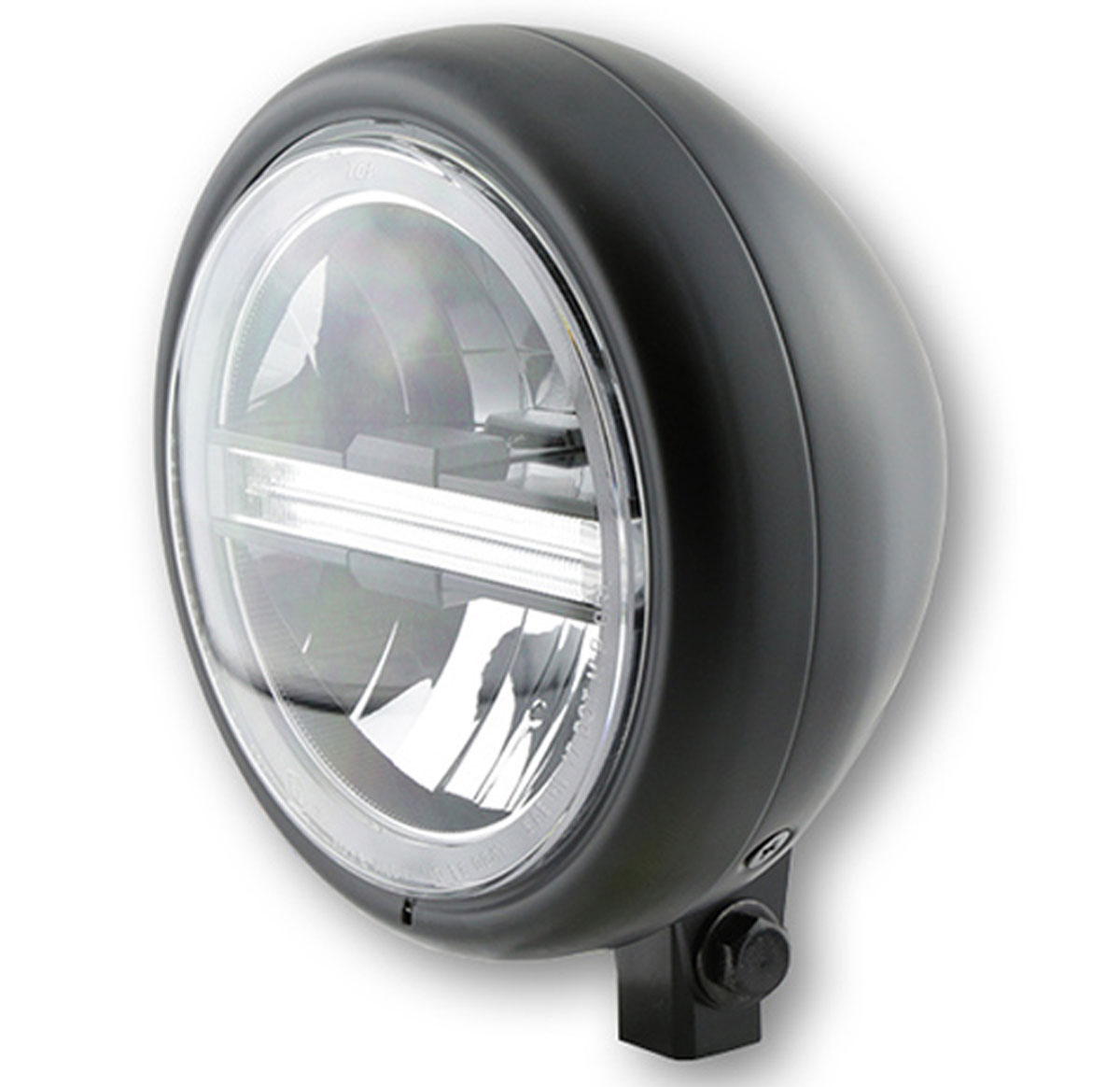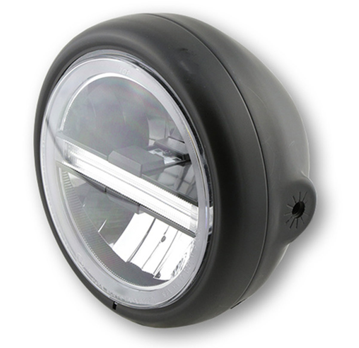 This Highsider 5 3/4 inch LED headlamp PECOS TYPE 6 has a built in DRL daytime running light running across the centre and a parking light ring. It comes in black bottom mount or black side mount versions.
