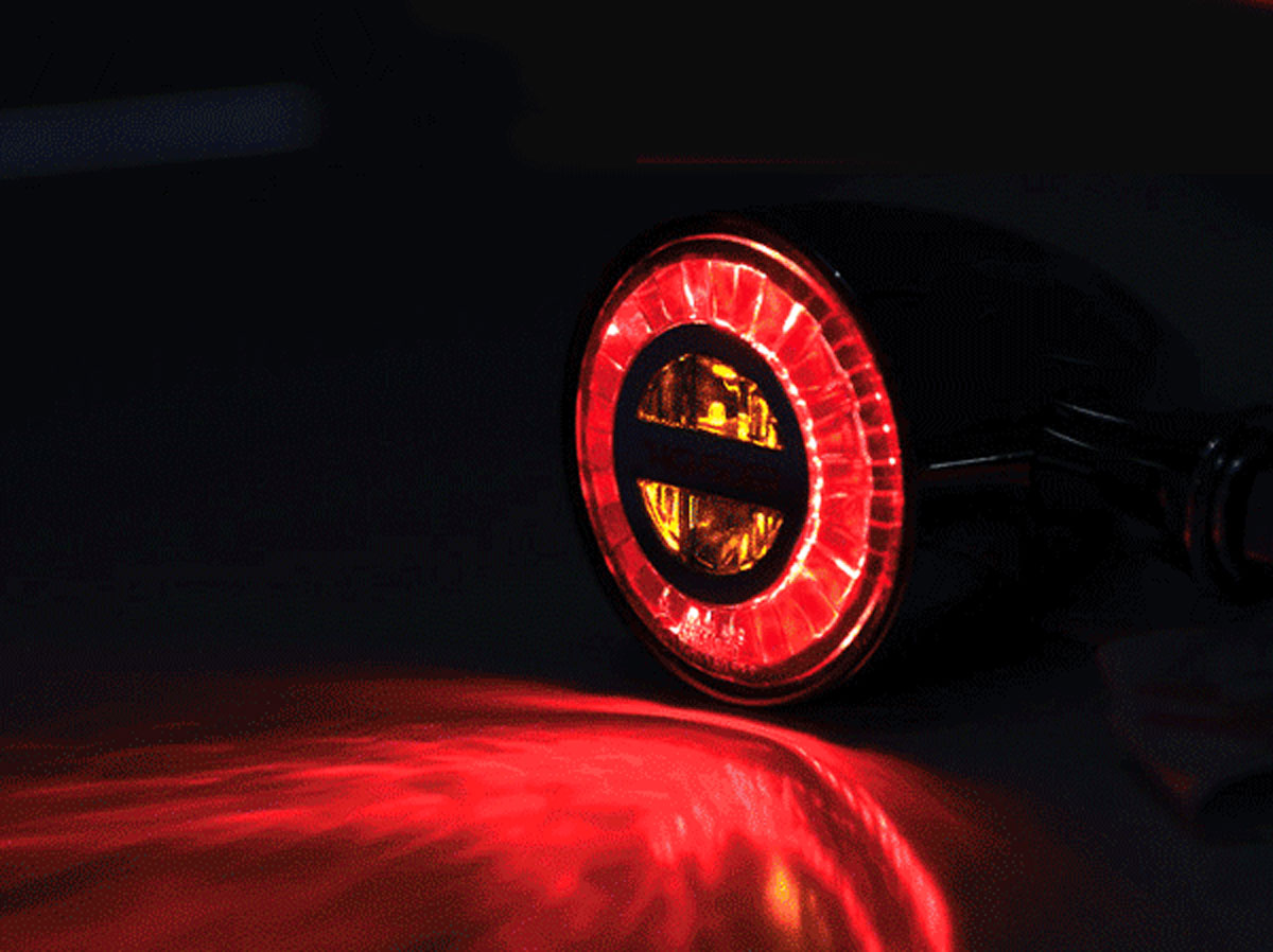 The outer ring contains the red rear stop and tail light and the central area the amber indicators.