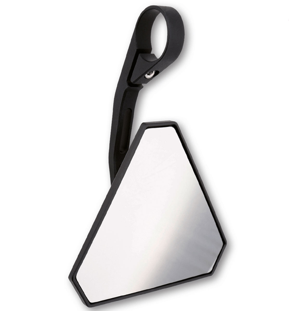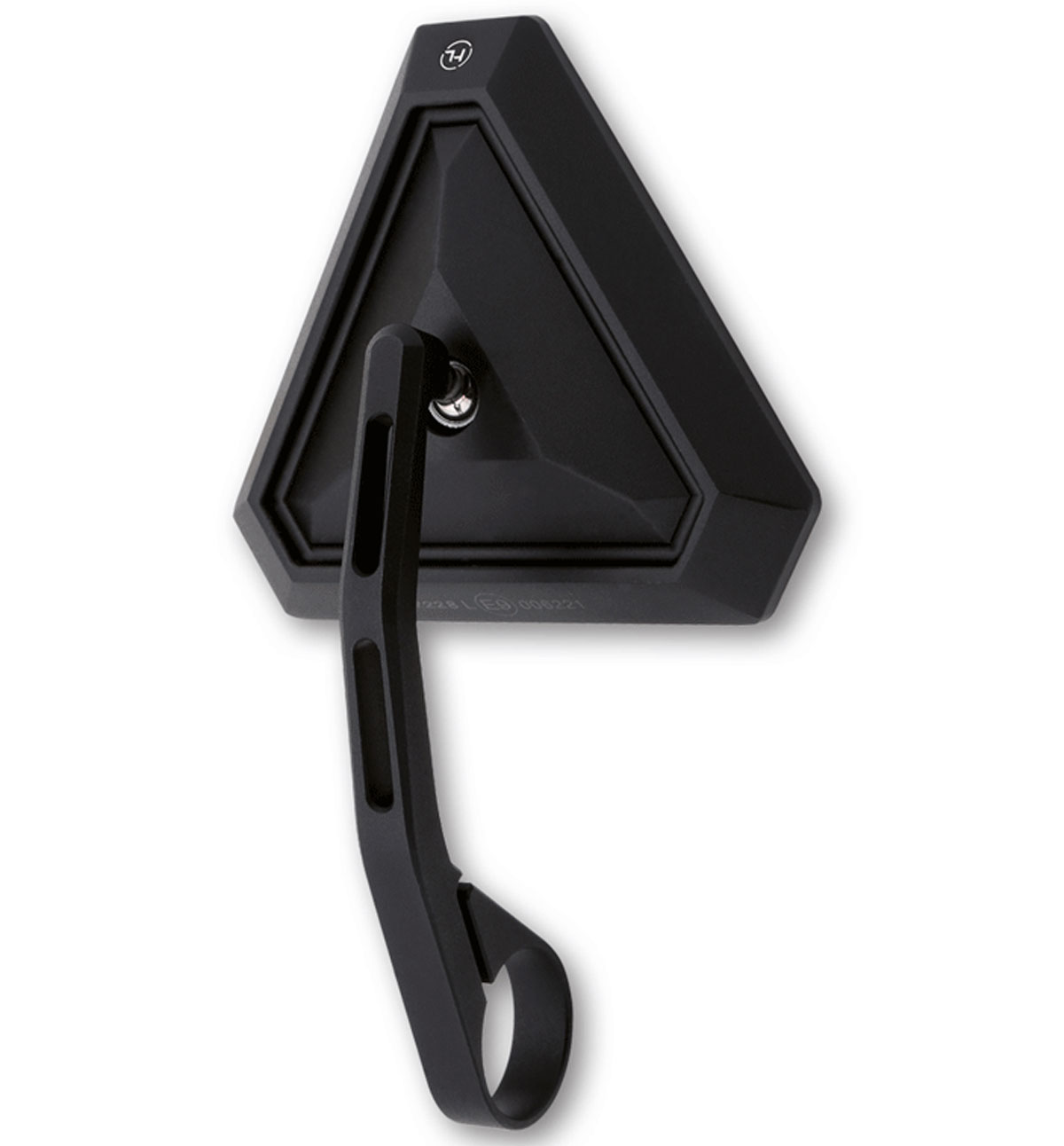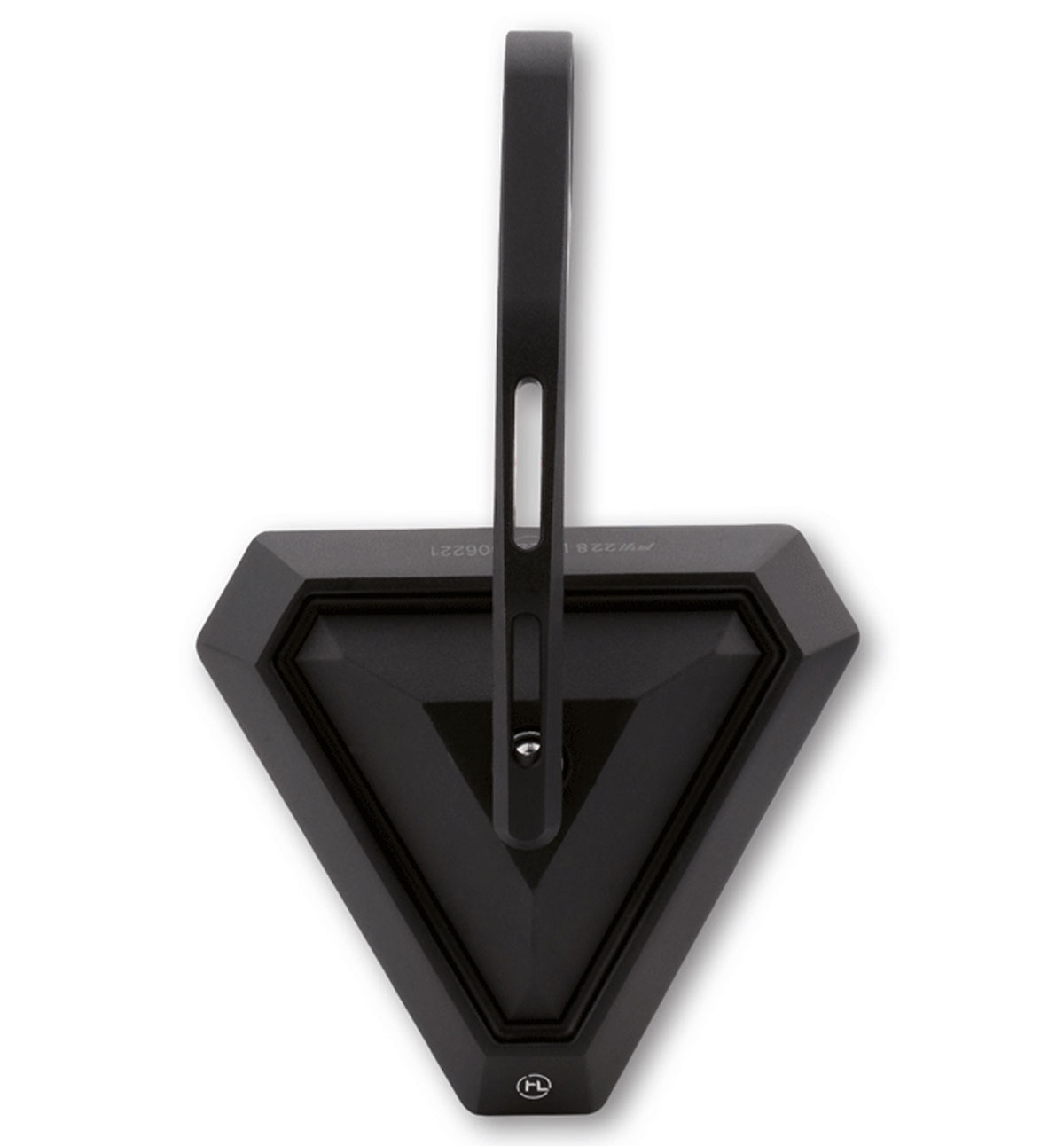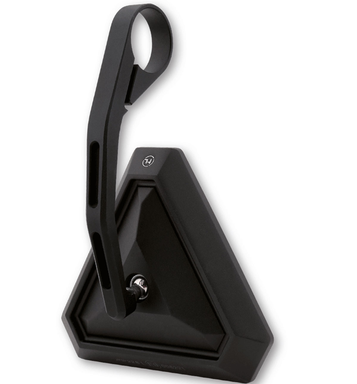 The unusual Highsider Tetra mirror with a triangle-shaped head made of semi-matt black anodized CNC aluminium for universal usage. The long mirror arm features sporty air slots and is adjustable at the mirror head to improve your view on the road - this adjustability allows the mirror to be used on either side, both upright or hanging down.
