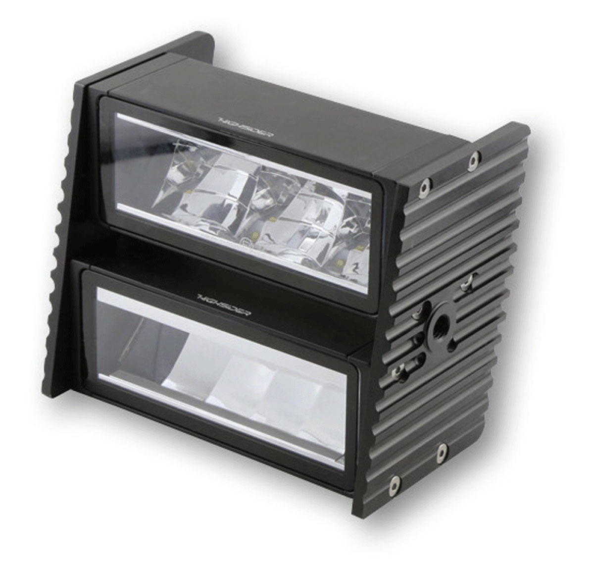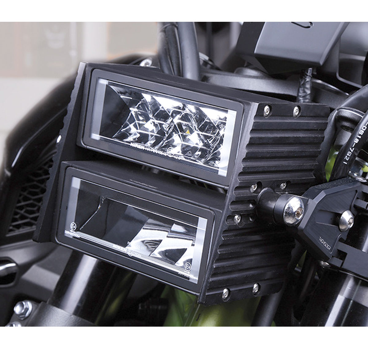 There are many round headlights. A rectangular headlamp make the motorcycle conspicuous. Connected with a WAVE-holder, this LED headlight set consists of a low- and high beam headlamp with position light. On the back side of the aluminum housing are cooling rib. The shape is perfect for Streetfighter, Cruiser and Street Bikes.
