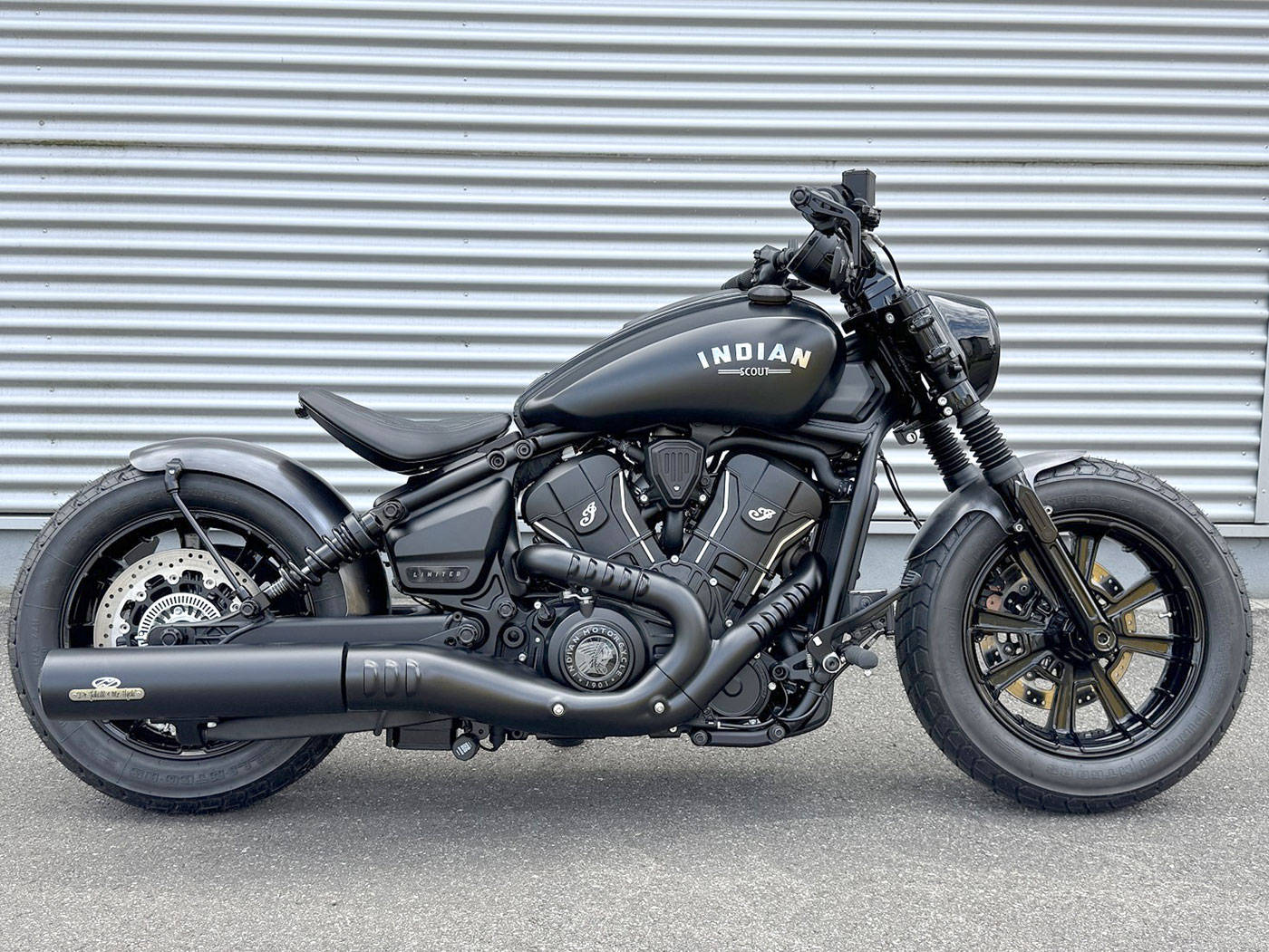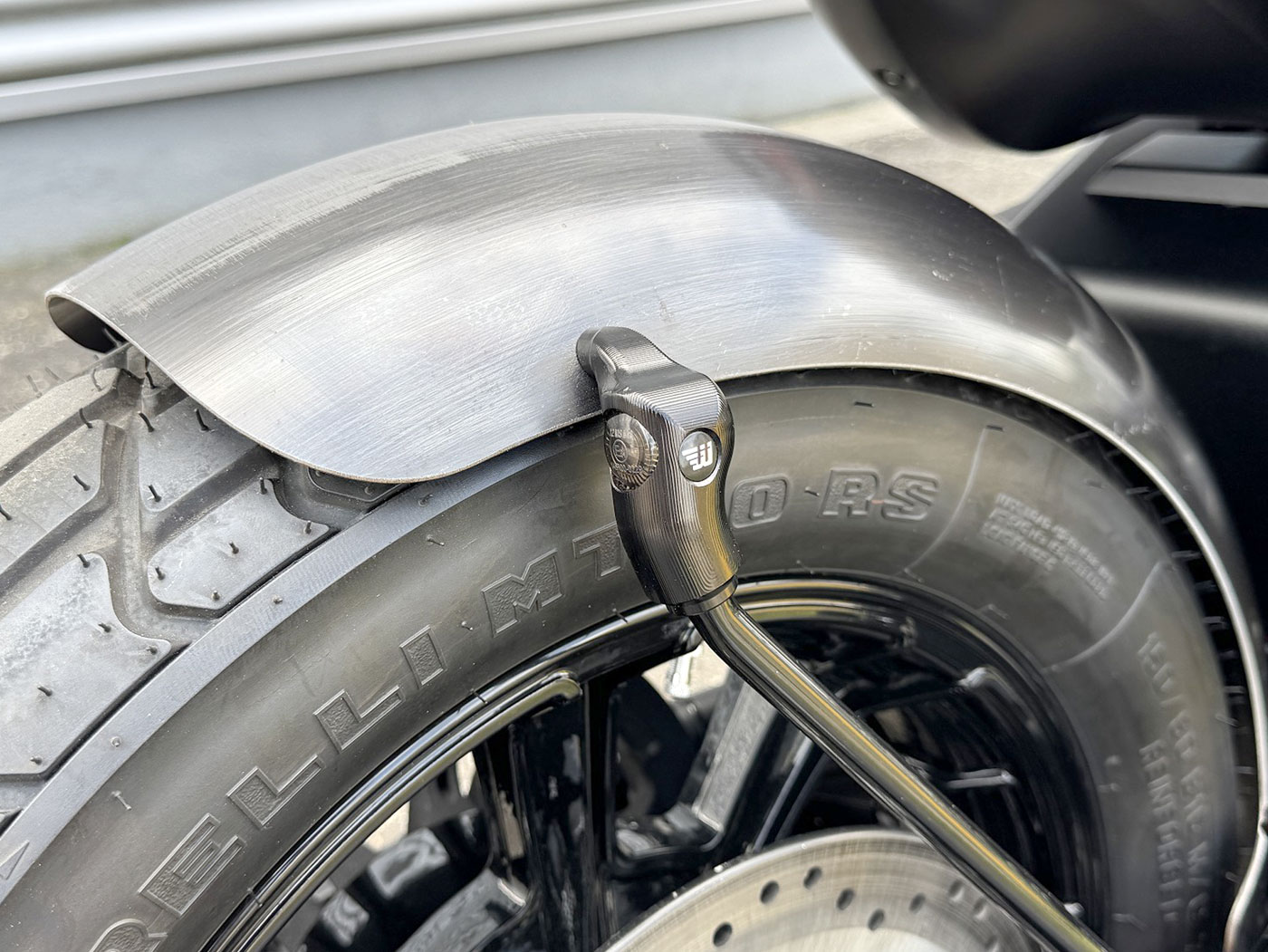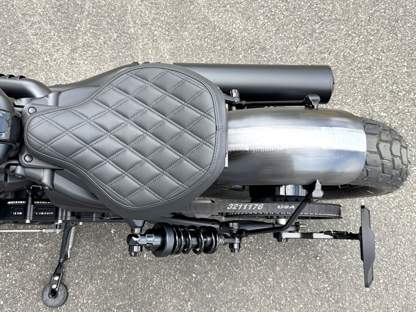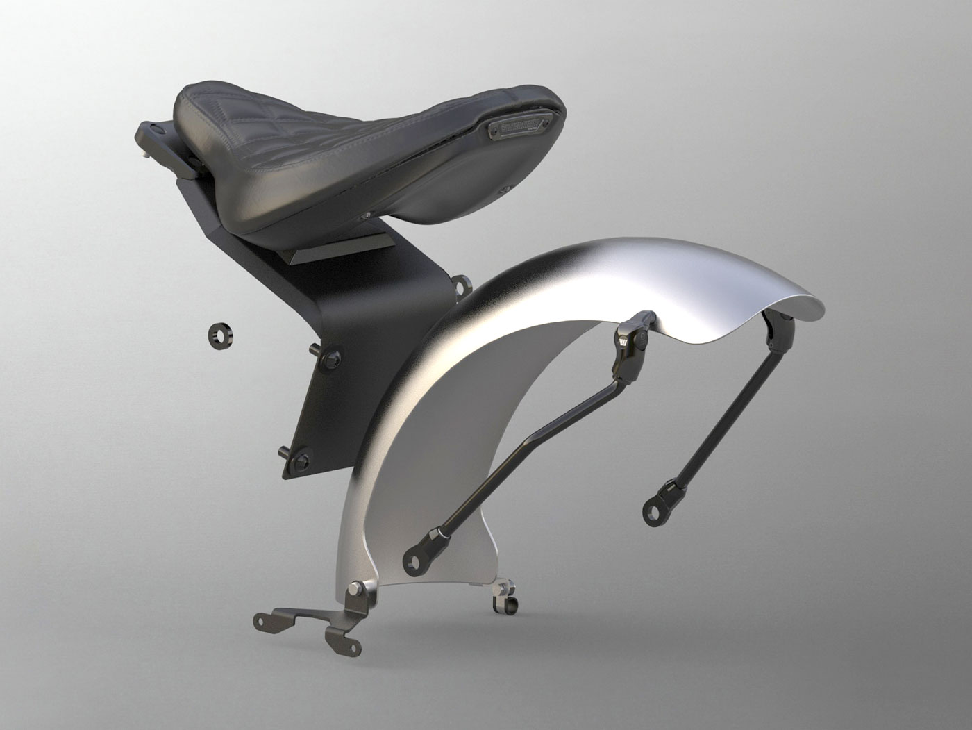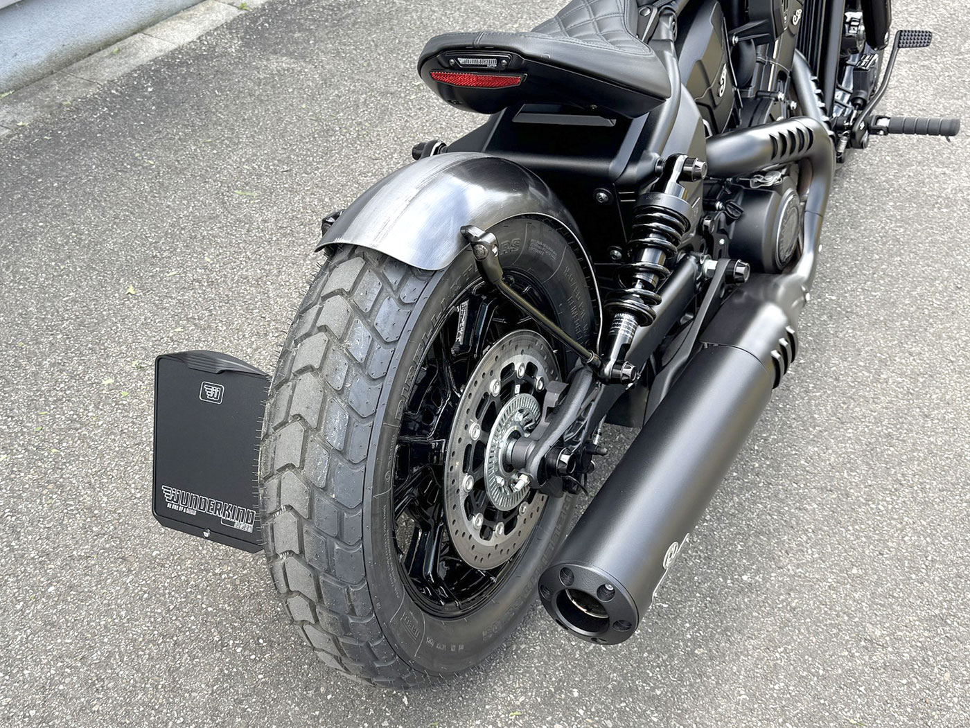 For the 1250cc Indian Scout Bobber 2024 onwards this (unpainted) Wunderkind rear mudguard fender kit comes complete with fender struts incorporating combination stop, tail and indicator lights. It also comes with and adjustable quilted and padded black seat and pan.