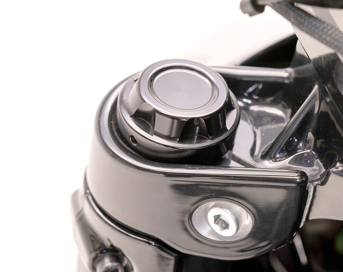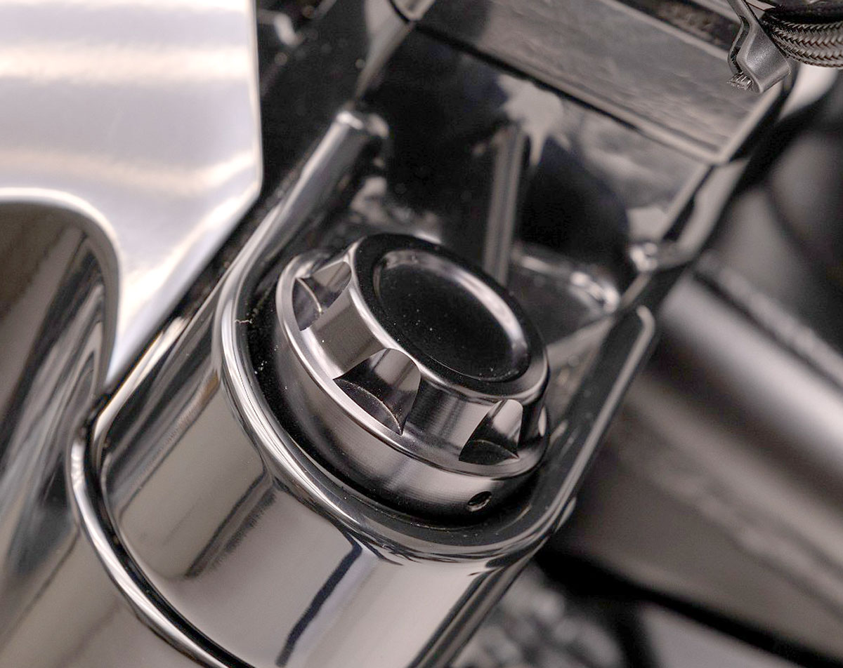 This pair of Wunderkind CNC Milled Fork Top Covers sit over the original closing plugs at the top of the fork tube on the Indian Scout Bobber 1130 2017-23 and the Scout Bobber 1250 2024 onwards..