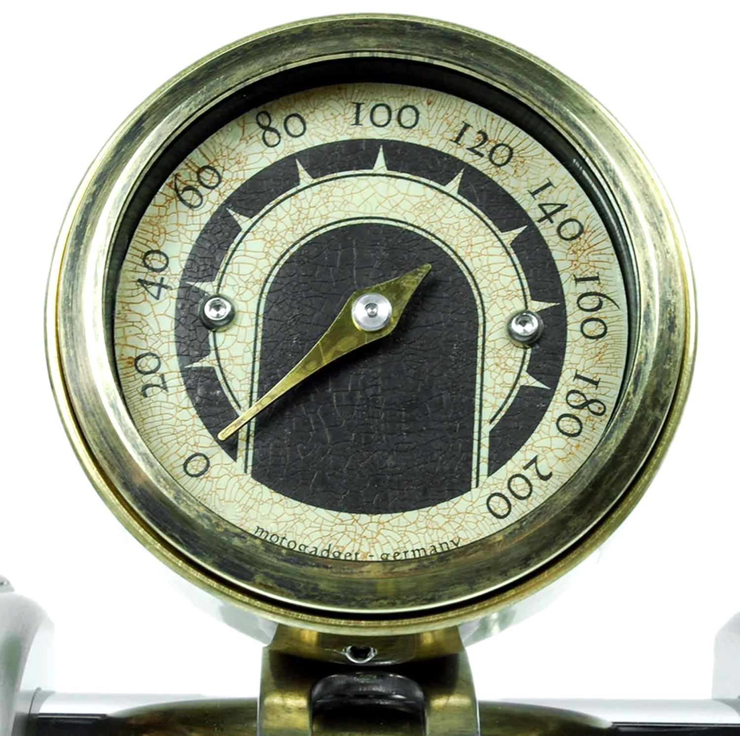 The Motogadget Motoscope Tiny MST Vintage Motorcycle Speedometer is a small, analogue speedometer with a brass bezel in an appealing 'old school' look.