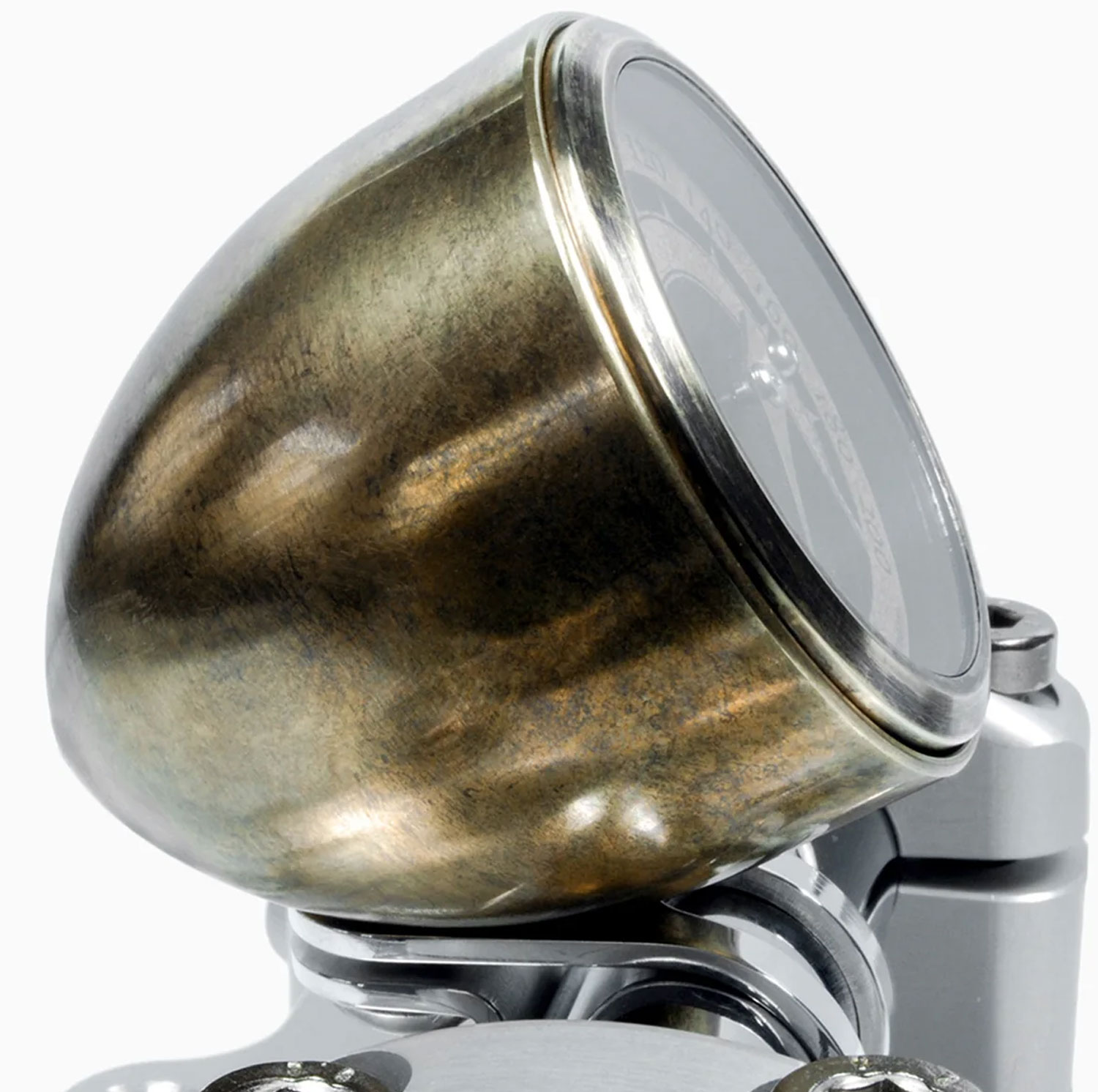 The bezel and indicator are made from solid brass and have been manually coated with patina. The created patterns and signs of aging vary with each instrument and give it an individual and unique look.