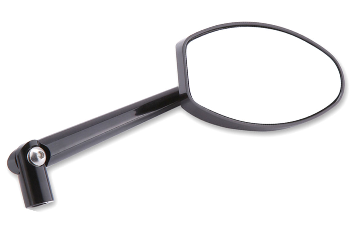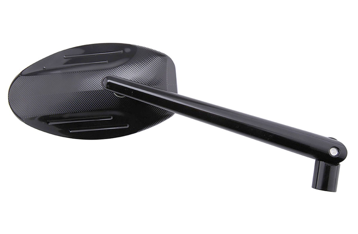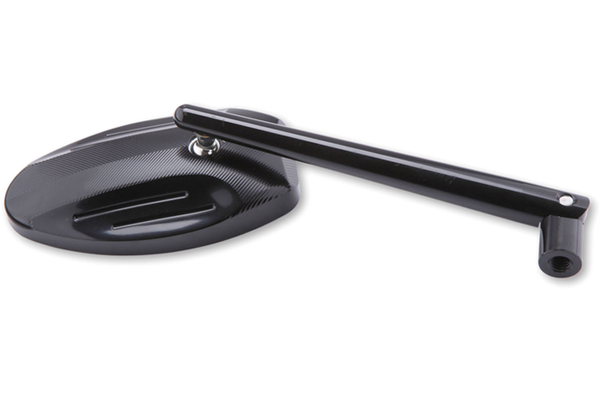 This Highsider smart Ferrara Universal Aluminium Handle Bar Mirror with matt black finish and a milled line detail on the rear of the oval aluminium head. The stem comes with a hinge for further adjustability and best rear view.